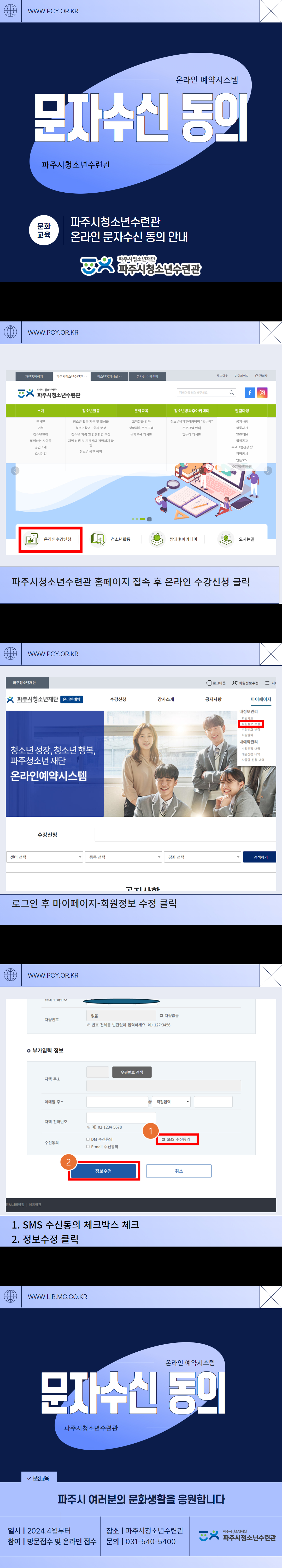 공지 파주시청소년수련관 SMS 수신동의 안내 작성자 운영자 등록일자 2024년 5월 30일 14시 51분 57초 조회 1,299 ※SMS 수신 미동의시 추후 파주시청소년수련관 프로그램 관련정보를 받지 못하게 되어 불이익이 발생할 수 있으므로, 반드시 확인 후 변경해주시기 바랍니다. 감사합니다. 온라인 예약시스템 문자 수신.jpg [ Size : 2.12MB , Down : 235 ] 미리보기 다운로드 목록보기