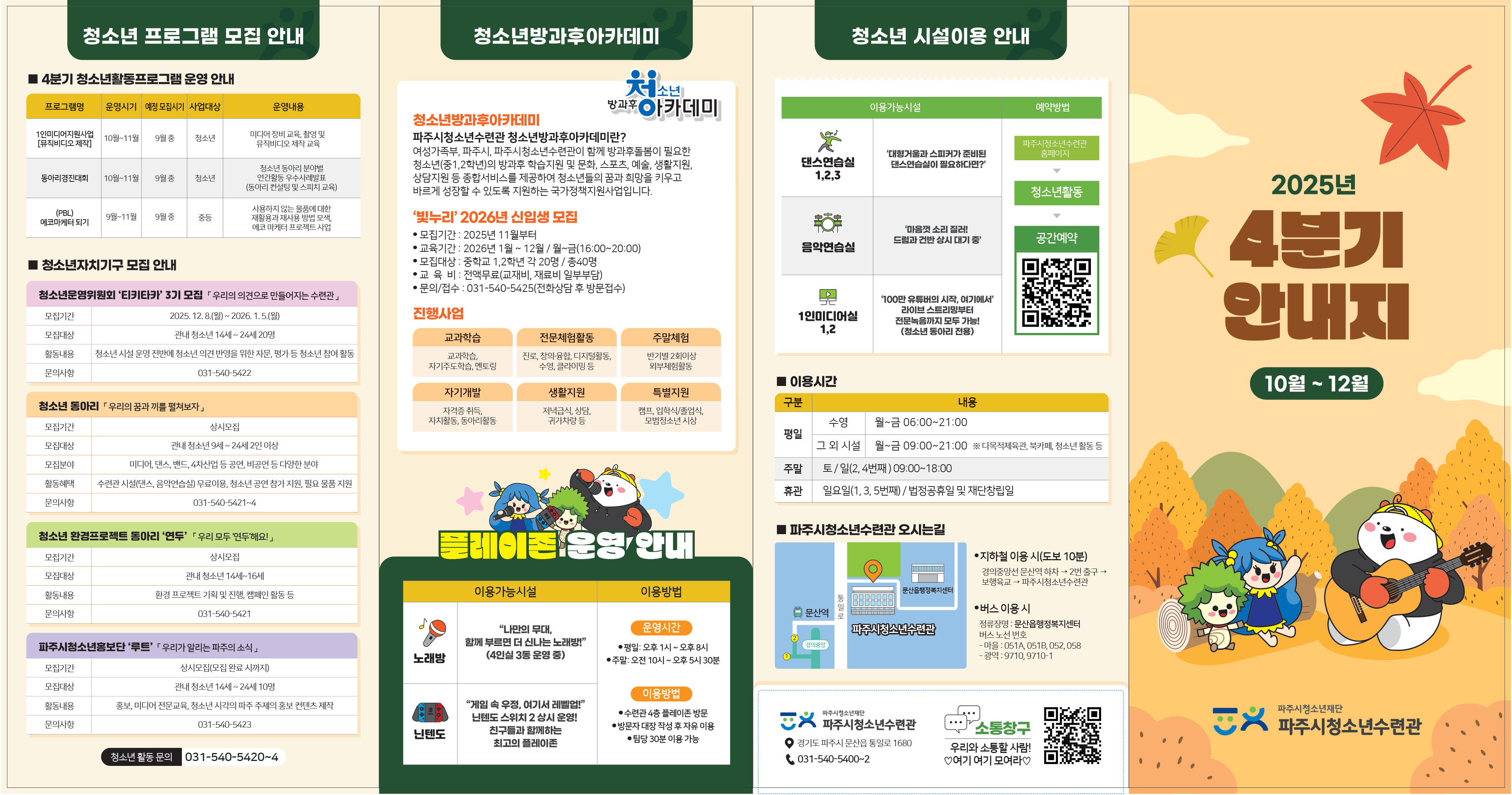 파주시청소년수련관 파주시청소년수련관 4분기 안내 작성자 운영자 등록일자 2025년 11월 27일 9시 7분 5초 조회 152 https://www.pcy.or.kr/pyc/bbs/board.php?bo_table=pyc_1&wr_id=67 후면.jpg [ Size : 2.89MB , Down : 64 ] 미리보기 다운로드 전면.jpg [ Size : 2.54MB , Down : 45 ] 미리보기 다운로드 목록보기